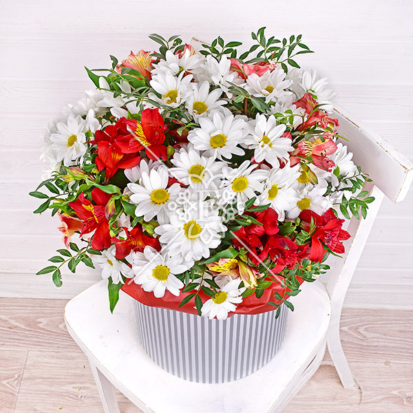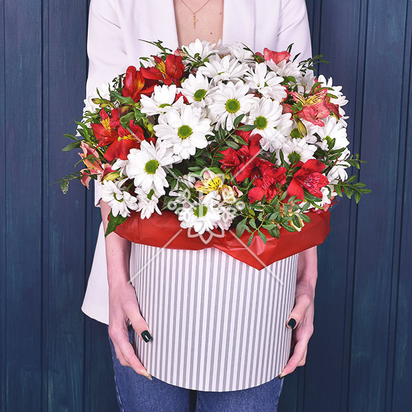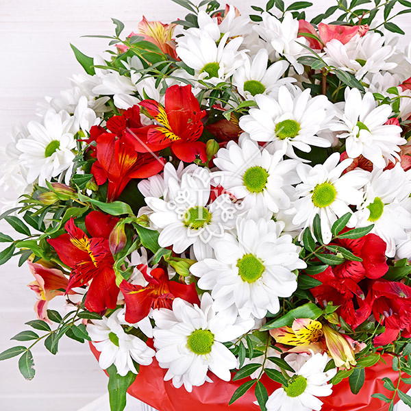 хризантема белая кустовая – 9 шт., альстромерия красная, розовая – 6 шт., декоративная зелень: фисташка, оазис, коробка.