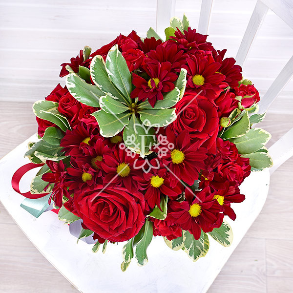 роза красная – 5 шт., роза красная кустовая – 4 шт., хризантема красная кустовая – 4 шт., зелень декоративная: питтоспорум, оазис, коробка, лента.