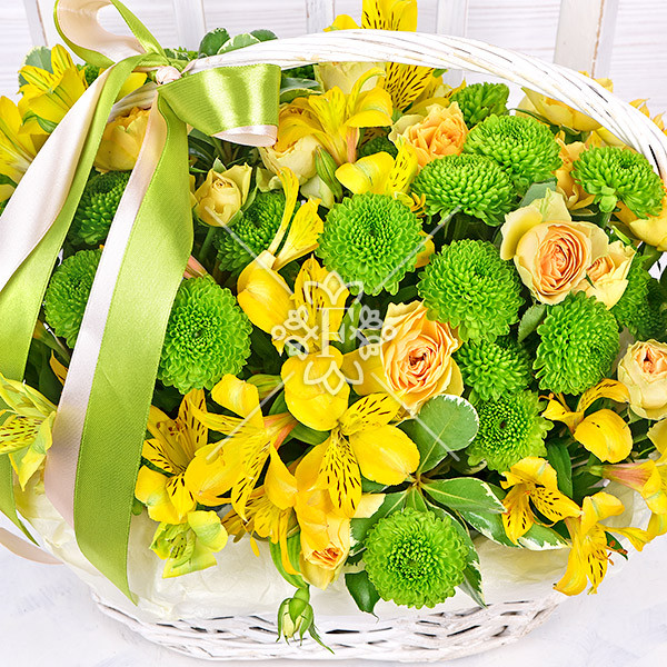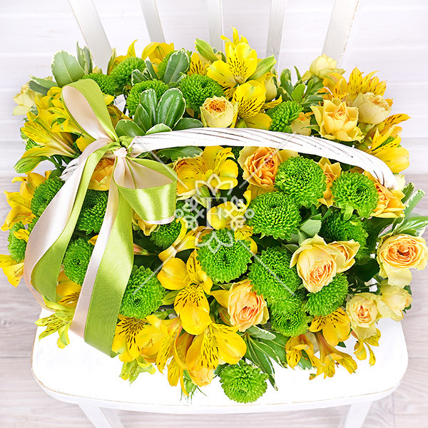 роза желтая кустовая – 5 шт., хризантема зеленая – 5 шт., альстромерия желтая -5 шт., зелень декоративная (питтоспорум), оазис, корзинка, лента