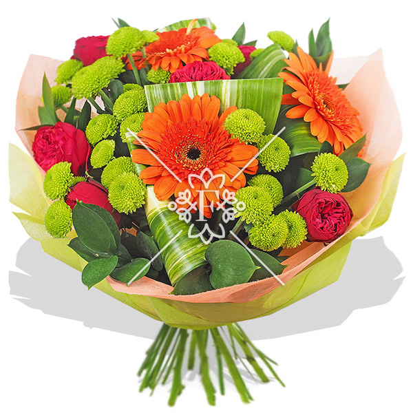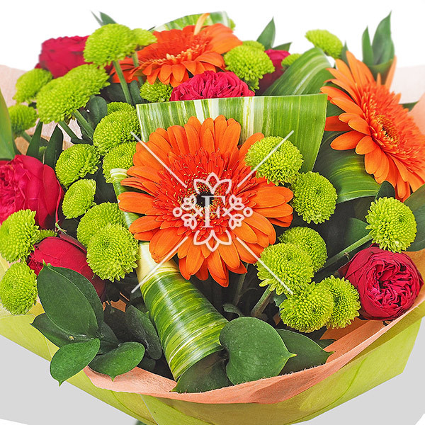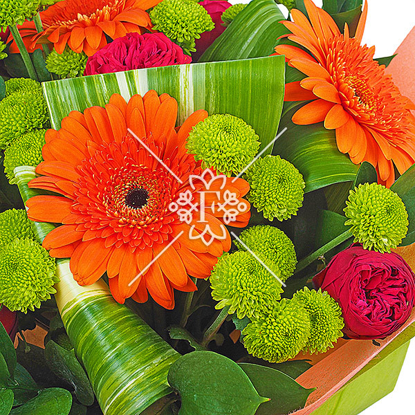 Красные розы  и  оранжевые герберы сочетаются здесь  с необыкновенно прекрасными  зелеными хризантемами. Цветы  в окружении аспидистры и рускуса в яркой упаковке  притягивают восхищенный взгляд ! Букет смотрится очень насыщенно и не банально!