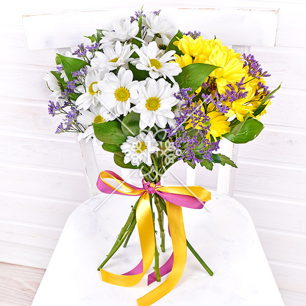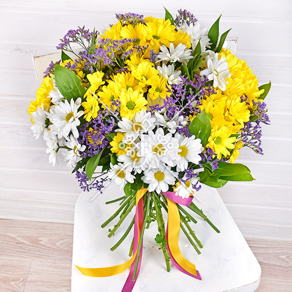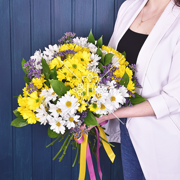 Сочетание белых и желтых  ромашковидных  хризантем, представленных в этом воздушном и очаровательном букете , выглядит  солнечно и свежо, а фиолетовый лимониум  и зелень рускуса подчеркивают  красоту  прекрасной композиции.
